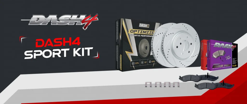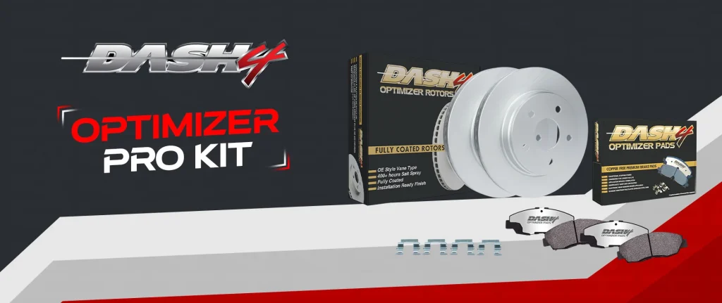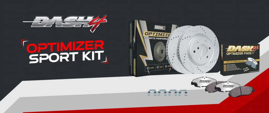 Affordable pads paired with performance rotors. Includes Dash4 Brake Pads and Optimizer Sports Performance Rotors for enhanced bite without breaking the budget.